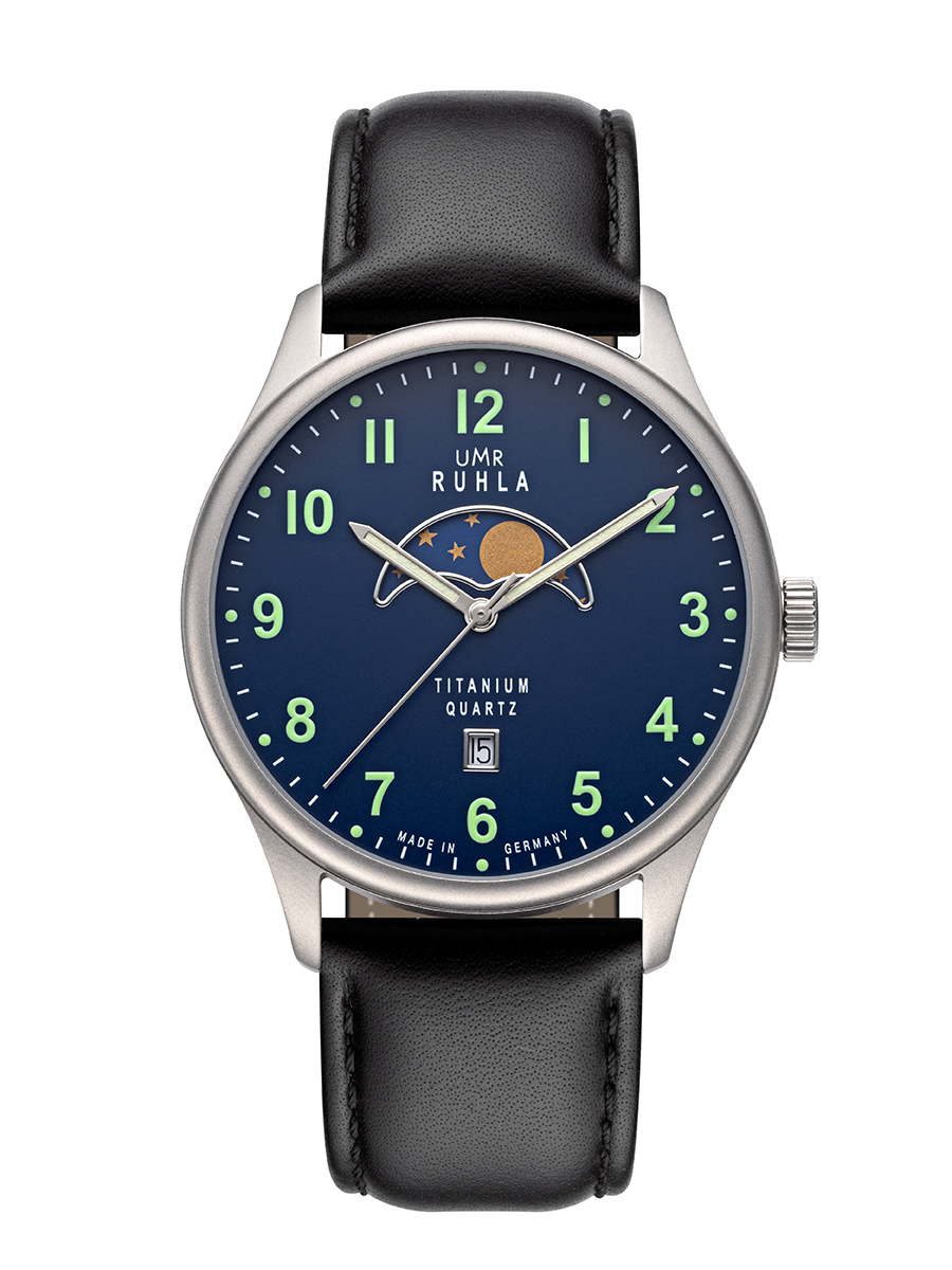 Elegante Mondphasen-Uhr mit quarzgesteuertem Werk und Datum auf 6 Uhr. Das matte Titangehäuse sorgt für außergewöhnliche Leichtigkeit und Robustheit, während das Zifferblatt mit grünen Leuchtzahlen und Leuchtpunkten beste Ablesbarkeit bei Tag und Nacht bietet. Geschützt durch widerstandsfähiges Mineralglas und wasserdicht bis 5 ATM.
