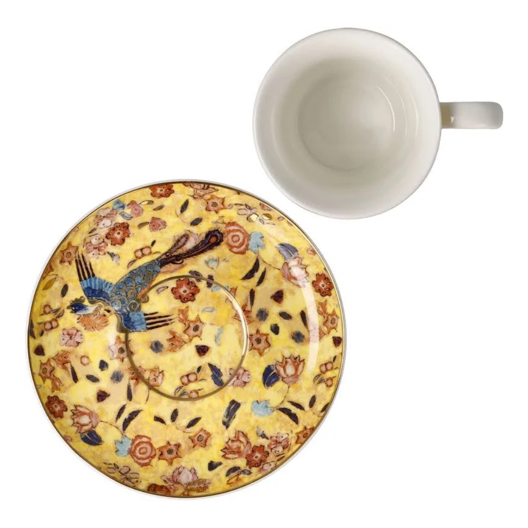 Genießen Sie Ihren Espresso mit einer Prise impressionistischer Leidenschaft. Diese elegante Tasse inklusive Unterteller präsentiert das berühmte Dame mit Fächer-Motiv in einem kraftvollen Gelbton. Dieses Motiv macht jede Kaffeepause zu einem kleinen kulturellen Highlight.