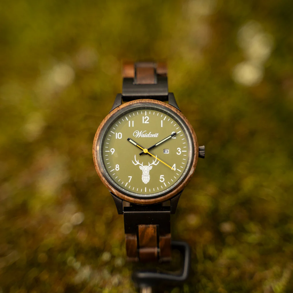 • Material: Holzgehäuse & Holzarmband oder Lodenarmband