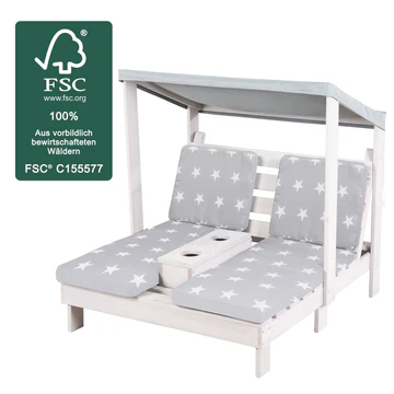 Die Outdoor-Doppelliege für Kinder ist eine perfekte Kombination aus Komfort und Stil für den Garten! Diese nicht nur optische Bereicherung, sondern auch äußerst bequeme Sitzgelegenheit lädt kleine Abenteurer zum Verweilen ein. Hergestellt aus FSC-zertifiziertem Massivholz, bietet sie eine robuste und kindgerechte Konstruktion, die für viele Monate Freude bereitet.