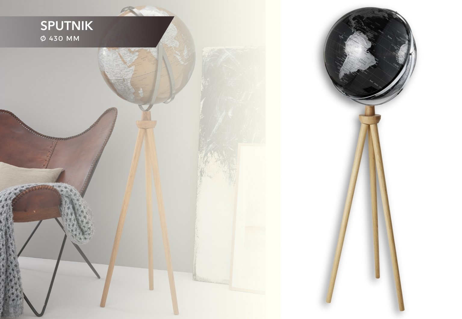 Das Standglobus Sputnik ist ein imposanter Globus, der mit seinem beeindruckenden Design und hochwertigen Materialien alle Blicke auf sich zieht. Sputnik war der Name für die ersten zehn sowjetischen Satelliten, die zwischen 1957 und 1961 ins Weltall geschickt wurden.