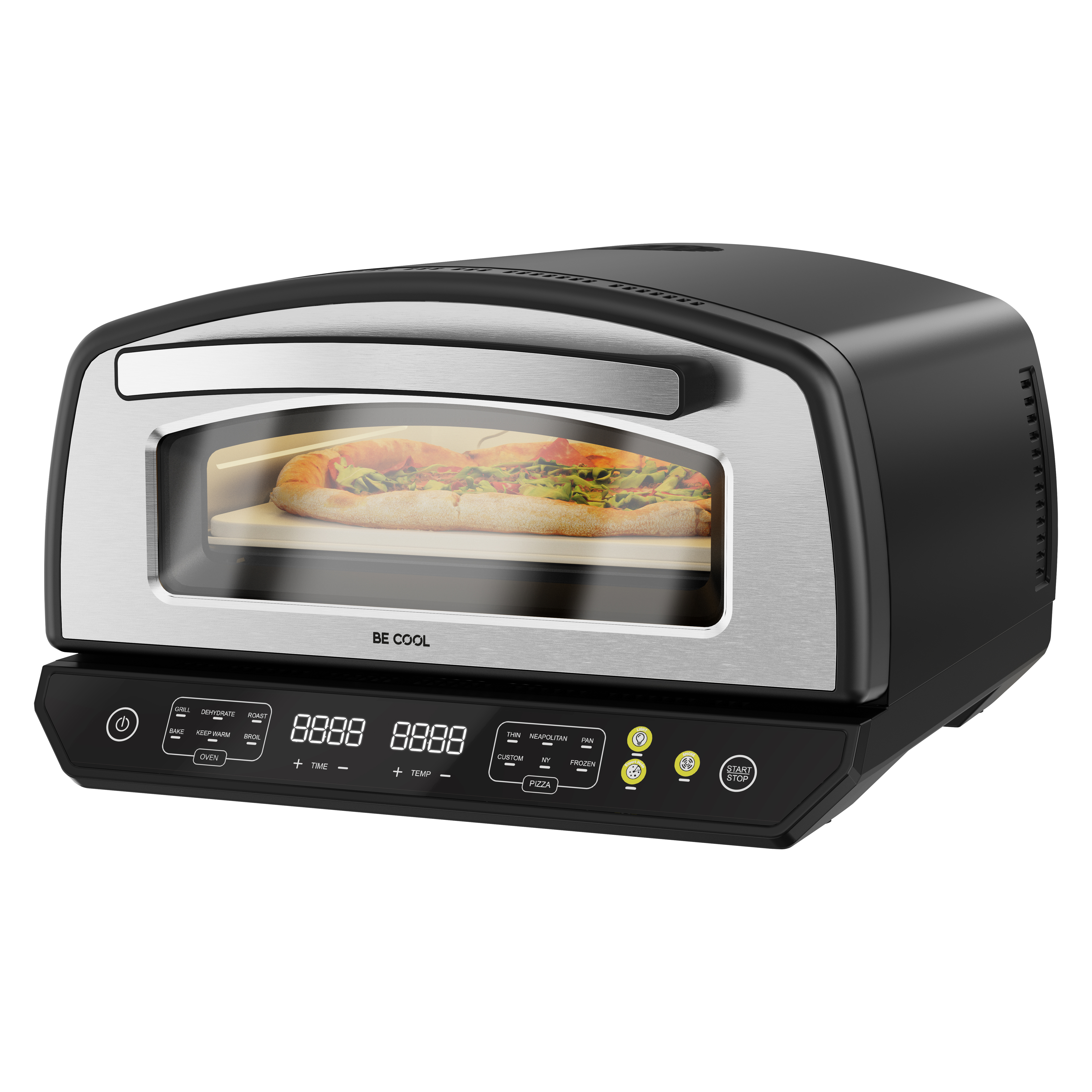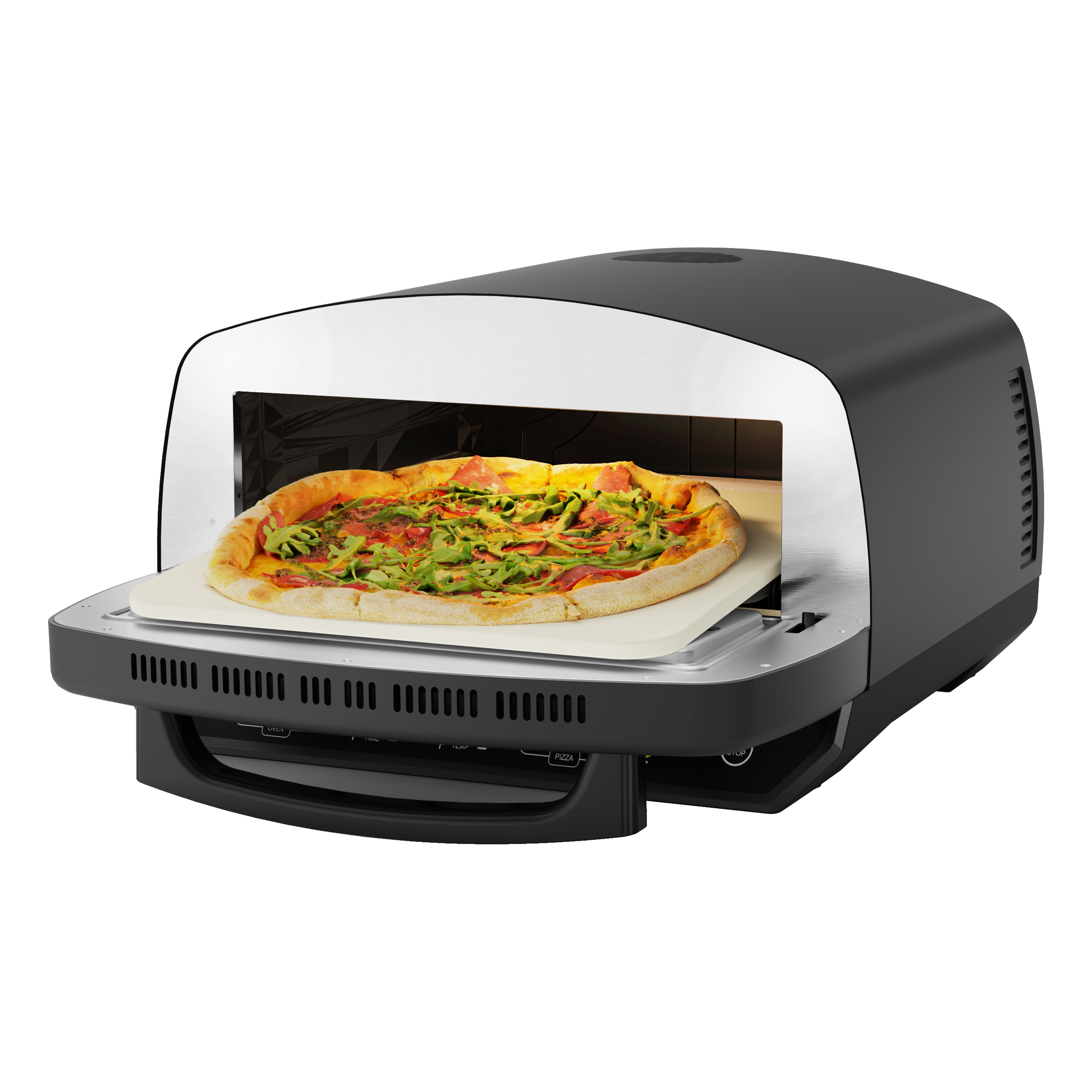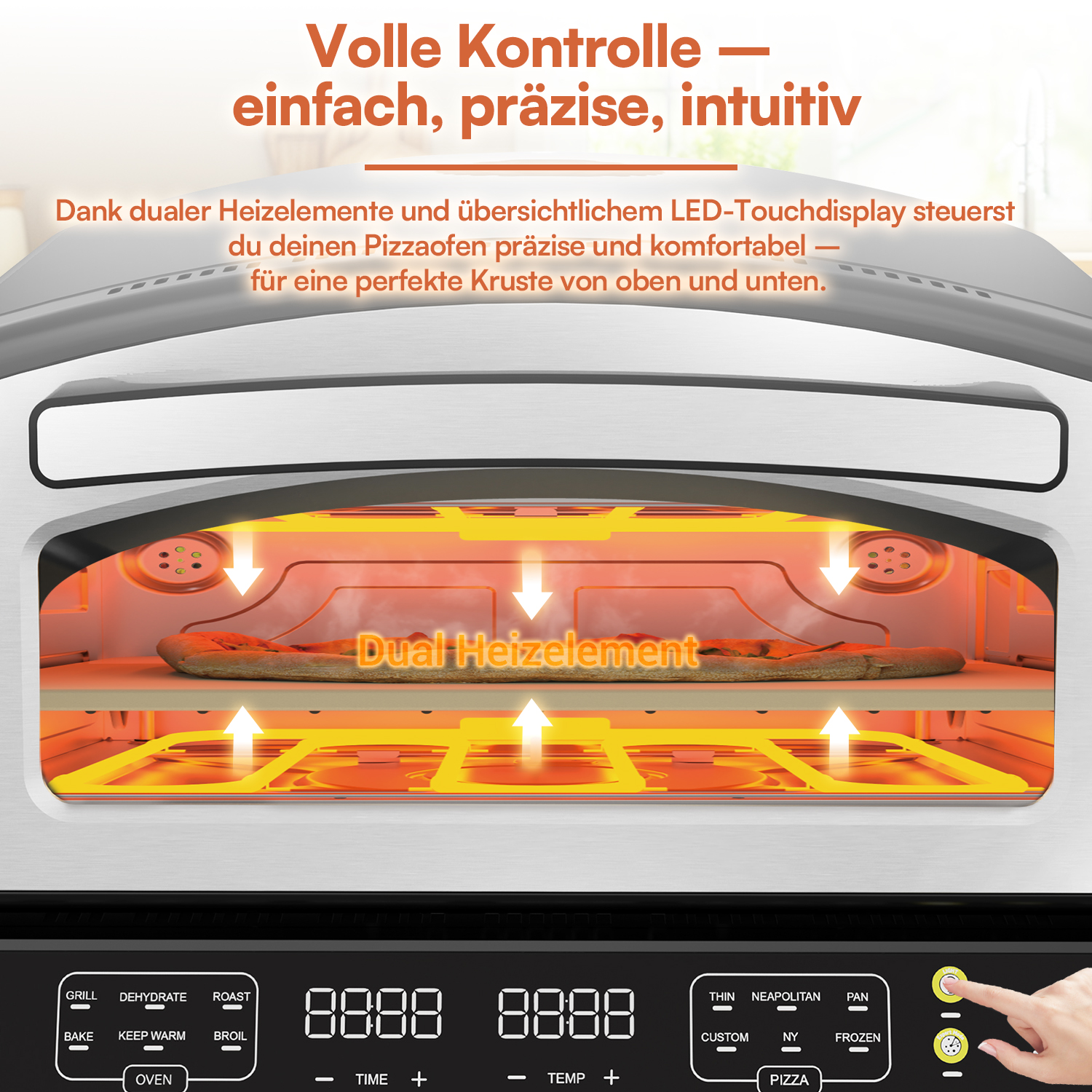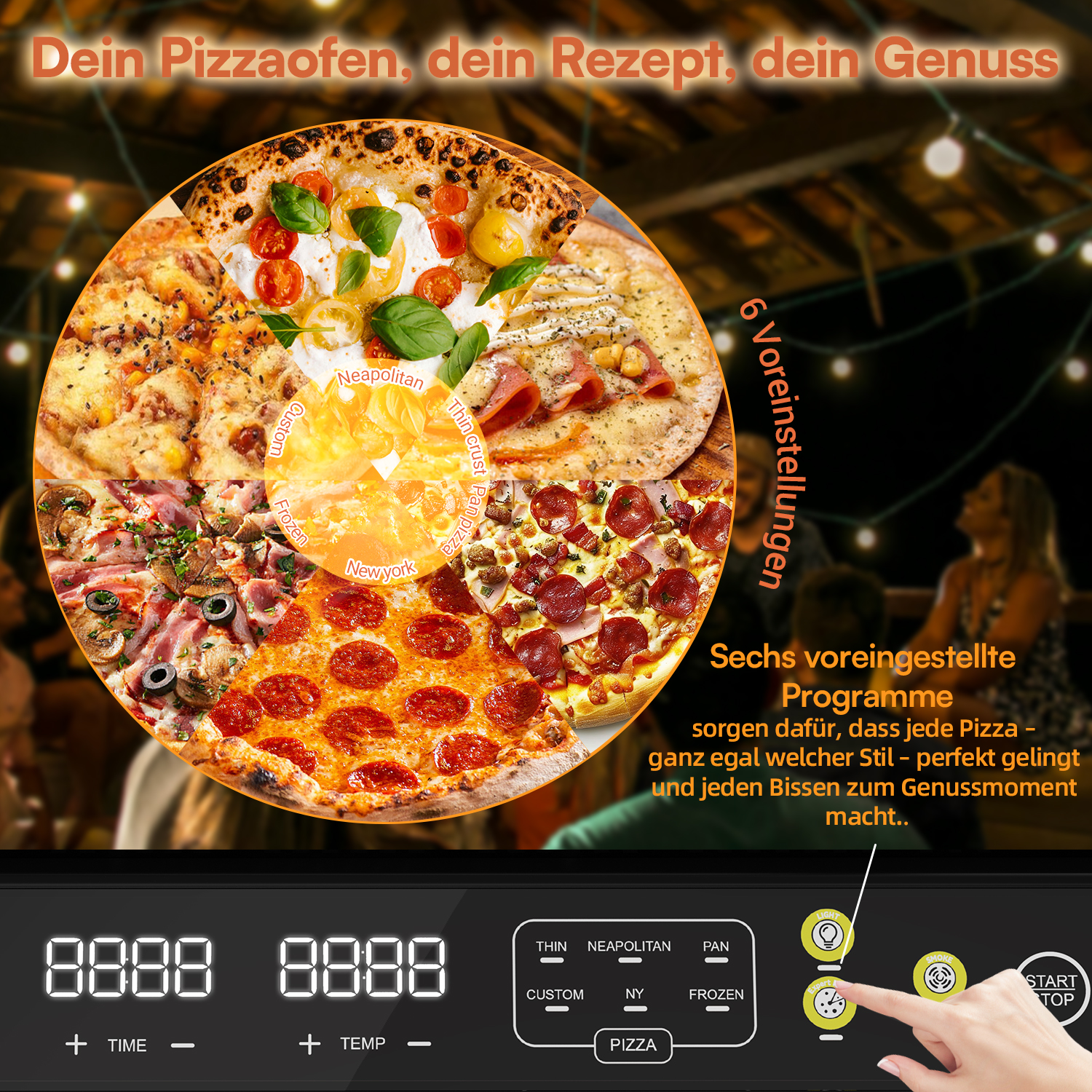 6 voreingestellte Pizza-Programme: Dünner Boden, New York, Pfannenpizza, Tiefgekühlt, Benutzerdefiniert, Neapolitanisch