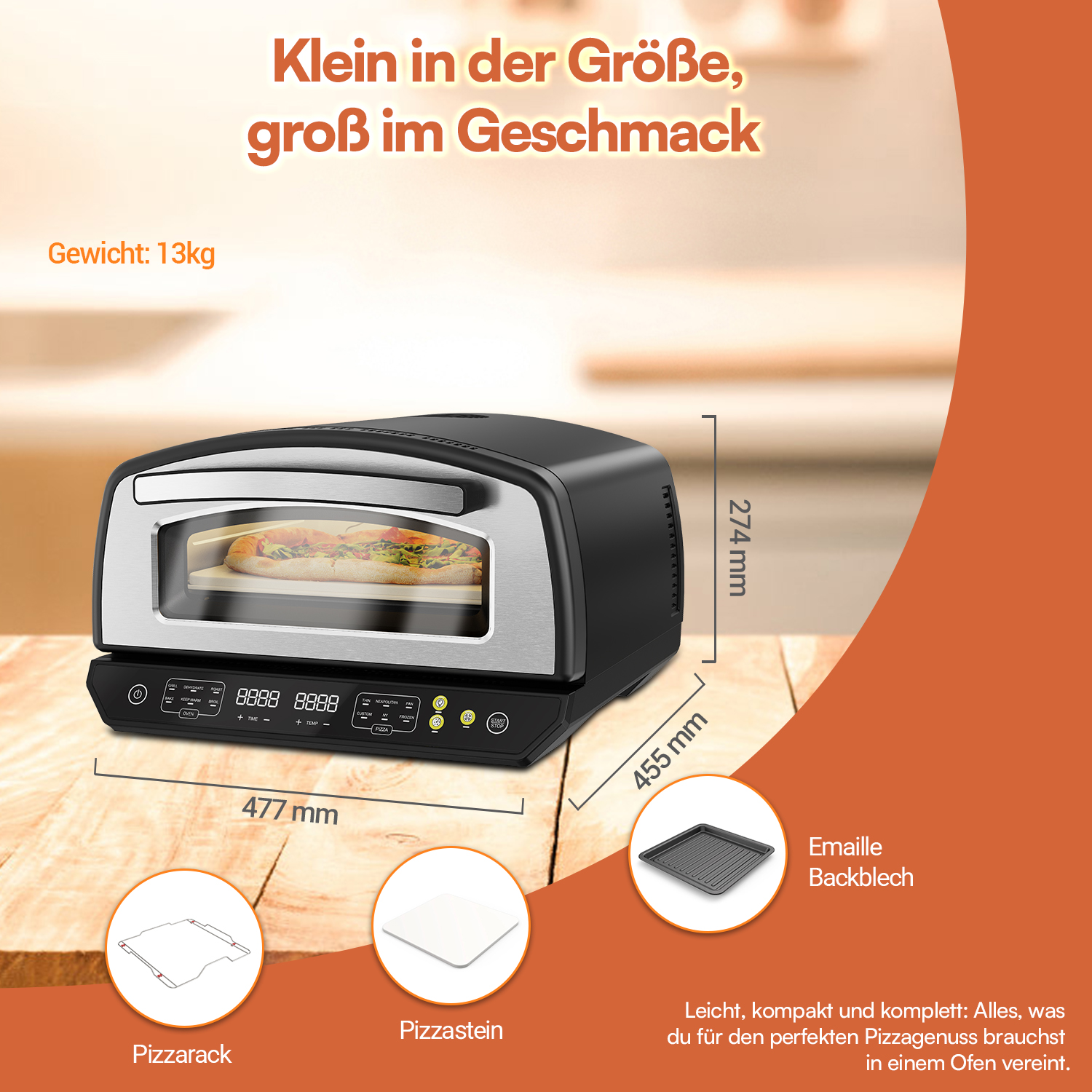 - Umfangreiches Zubehör: Pizzastein, Emaille-Backblech, Pizzarack