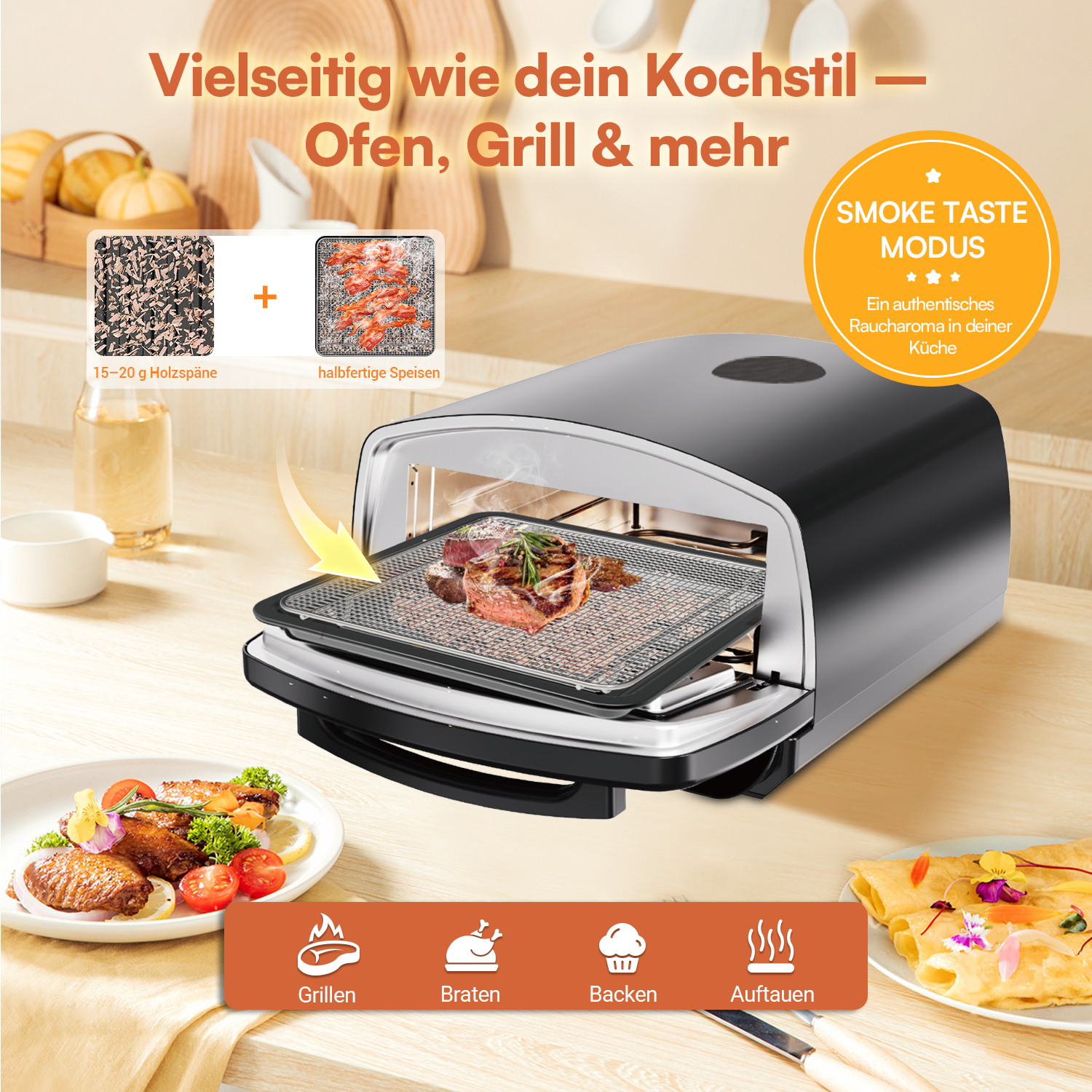 - Vier vielseitige Heizfunktionen: Grillen, Backen, Überbacken, Braten