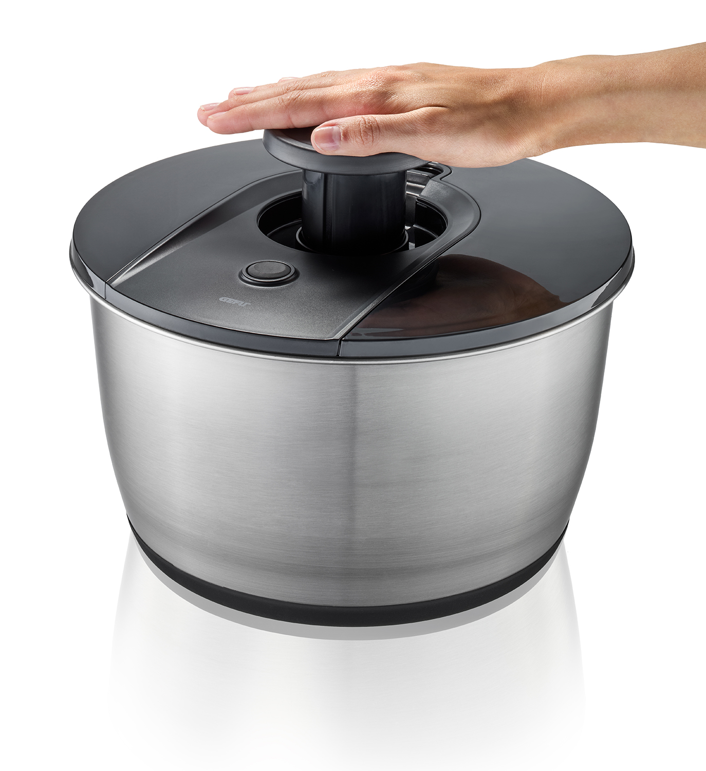 Die formschöne Edelstahlschüssel eignet sich nicht nur zum Schleudern, sondern auch ideal zum direkten Servieren. Ein rutschfester Silikonboden sorgt für sicheren Stand während des gesamten Vorgangs.
