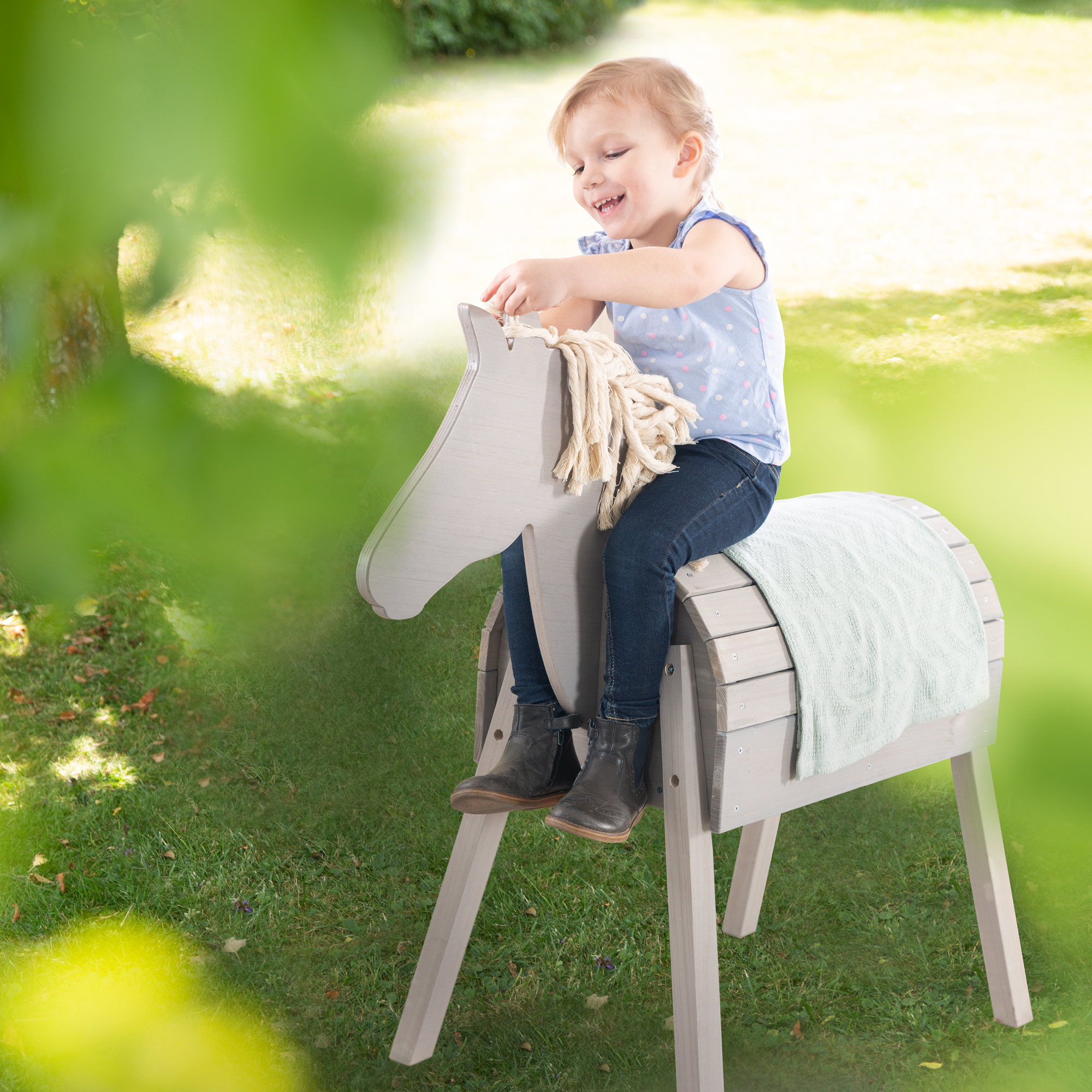 Gefertigt aus wetterbeständigem Massivholz (Teak-Optik), hält dieses robuste Outdoor-Pferd jeder Witterung stand. Die kämmbare Mähne und der Schweif aus hochwertigem Sisal laden zum Striegeln und Einflechten ein – für ein besonders realitätsnahes Spielerlebnis. Ein stabiler Stand sorgt dabei für maximale Sicherheit bei jedem Abenteuer.