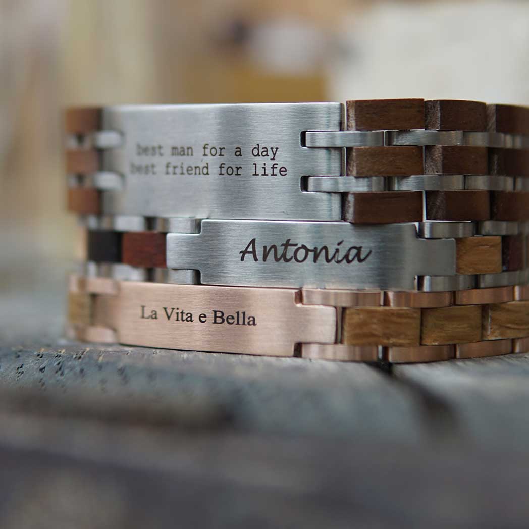 Das Besondere an den Armbändern von Waidzeit ist die Wiederverwertung von Fassholz (Barrique, Whisky, Rum).