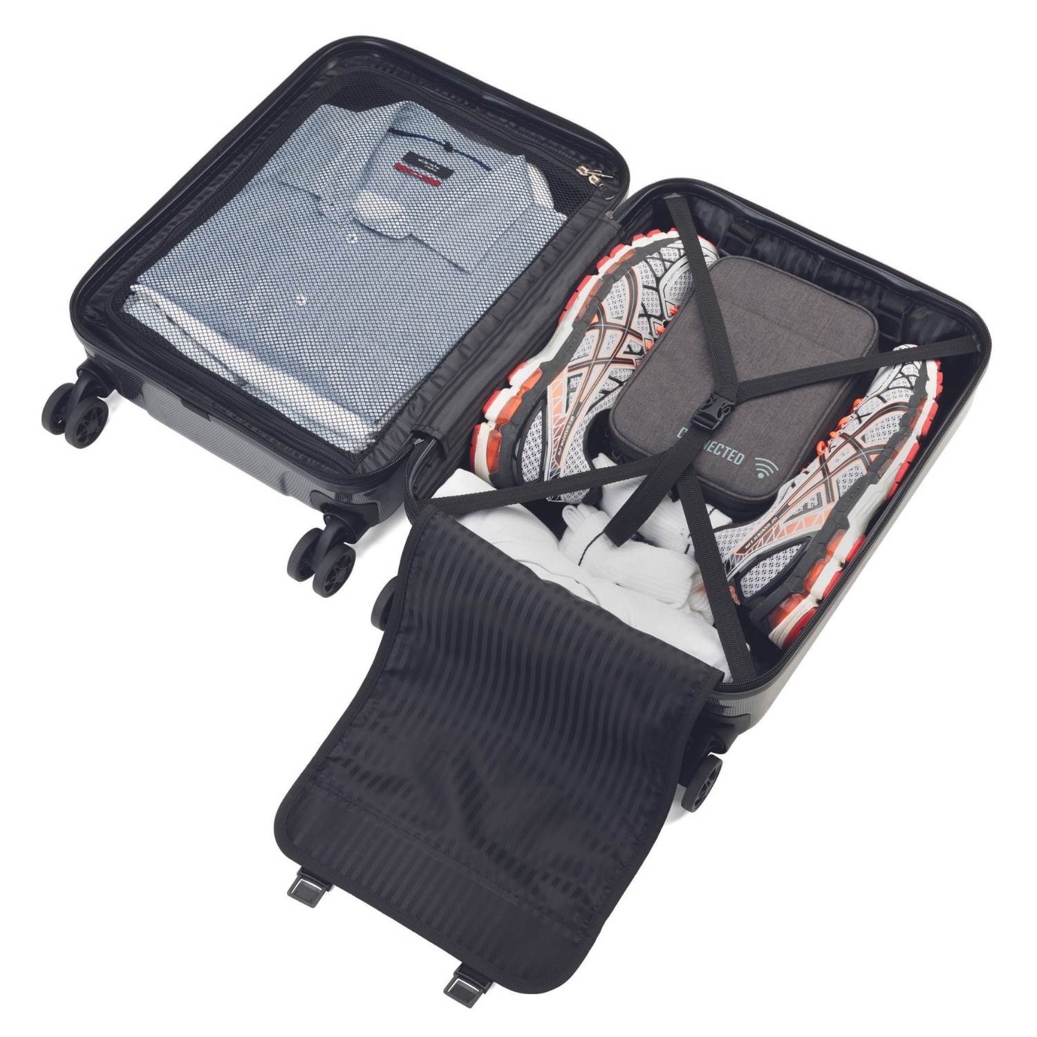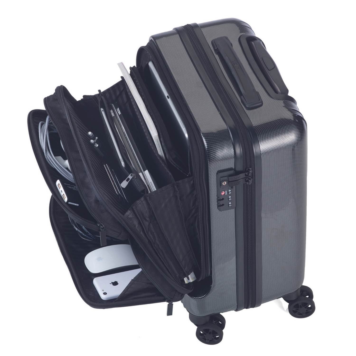 Der Business-Trolley vereint eine robuste Hartschale mit flexiblen Softbags und bietet so die ideale Lösung für Geschäftsreisen. Die Hartschale schützt das Gepäck, während die integrierten Softbags schnellen Zugriff auf Geschäftsunterlagen, Reisedokumente und mobile Geräte ermöglichen. Das größere Fach bietet sogar Platz für einen Laptop bis zu 13".