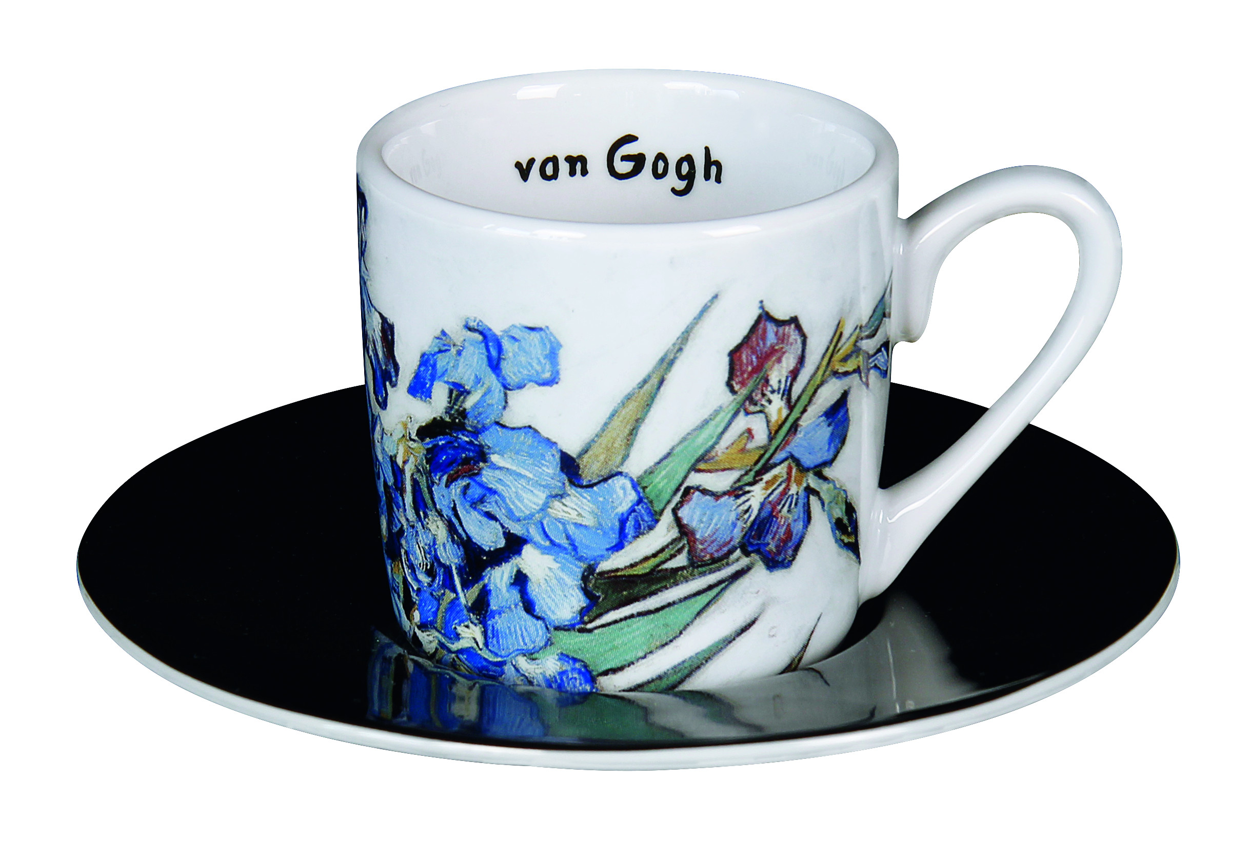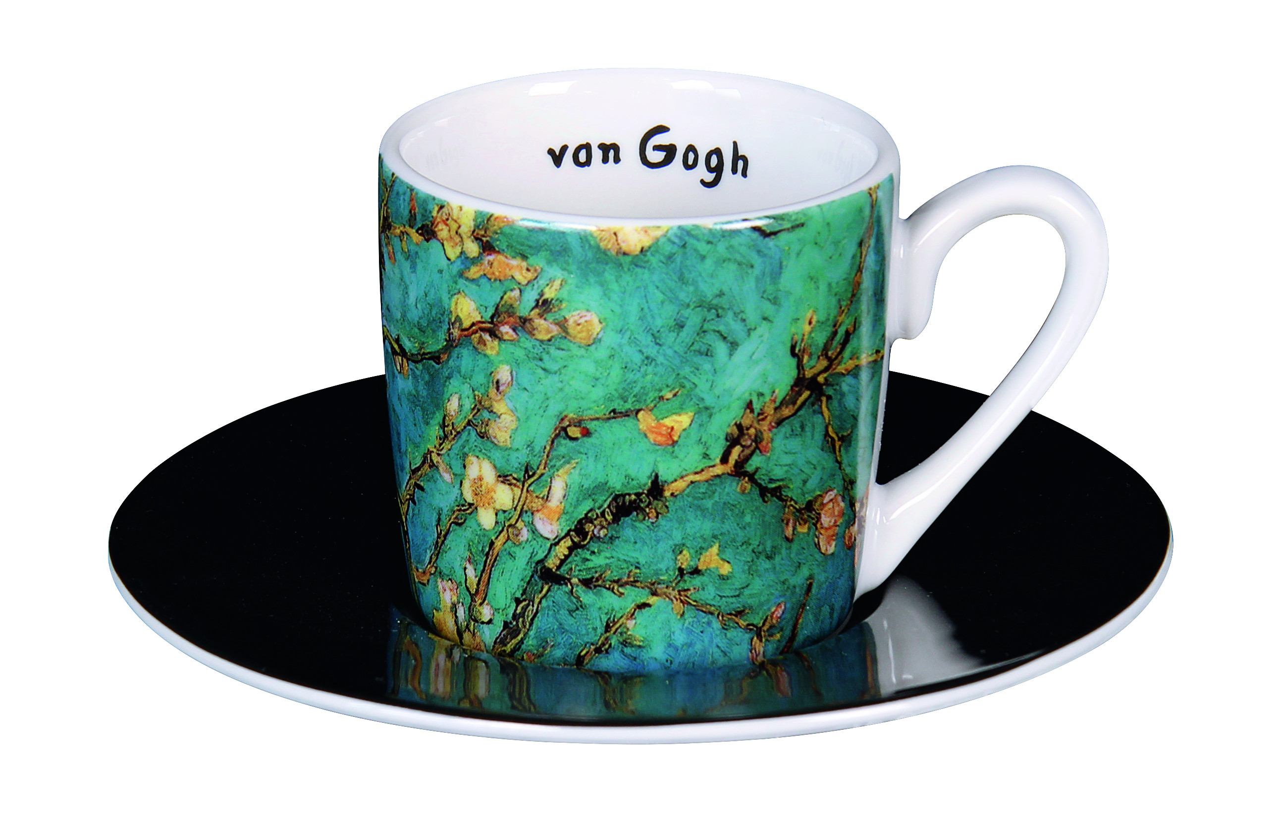 Hochwertiges Porzellanset mit Vincent van Goghs komponierten Werken. Die schwarzen Untertassen bilden einen wirkungsvollen Kontrast zu den farbigen Motiven.