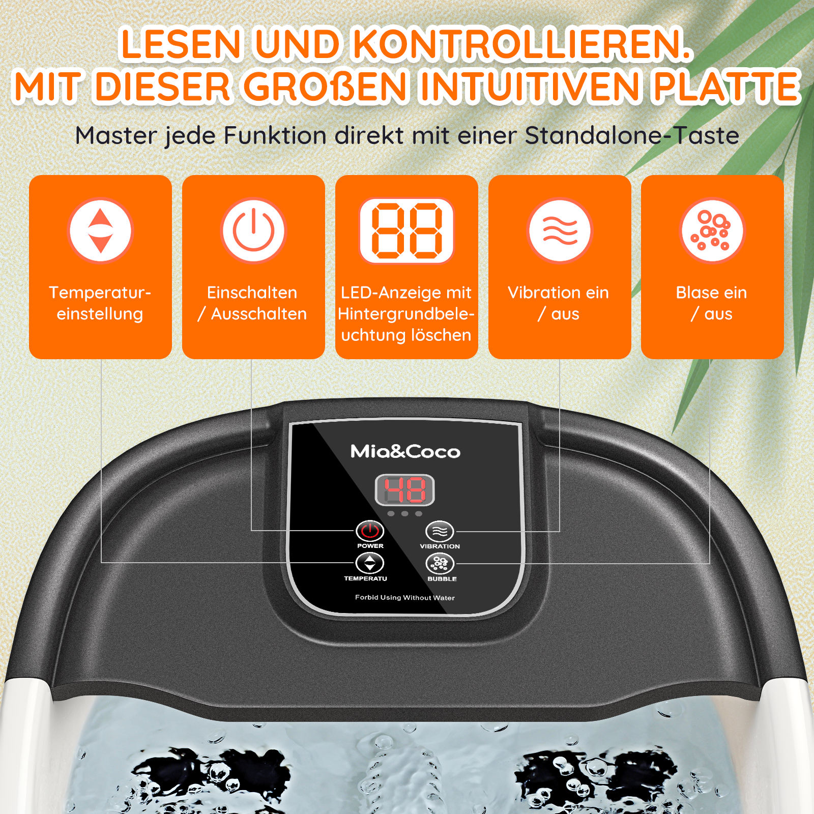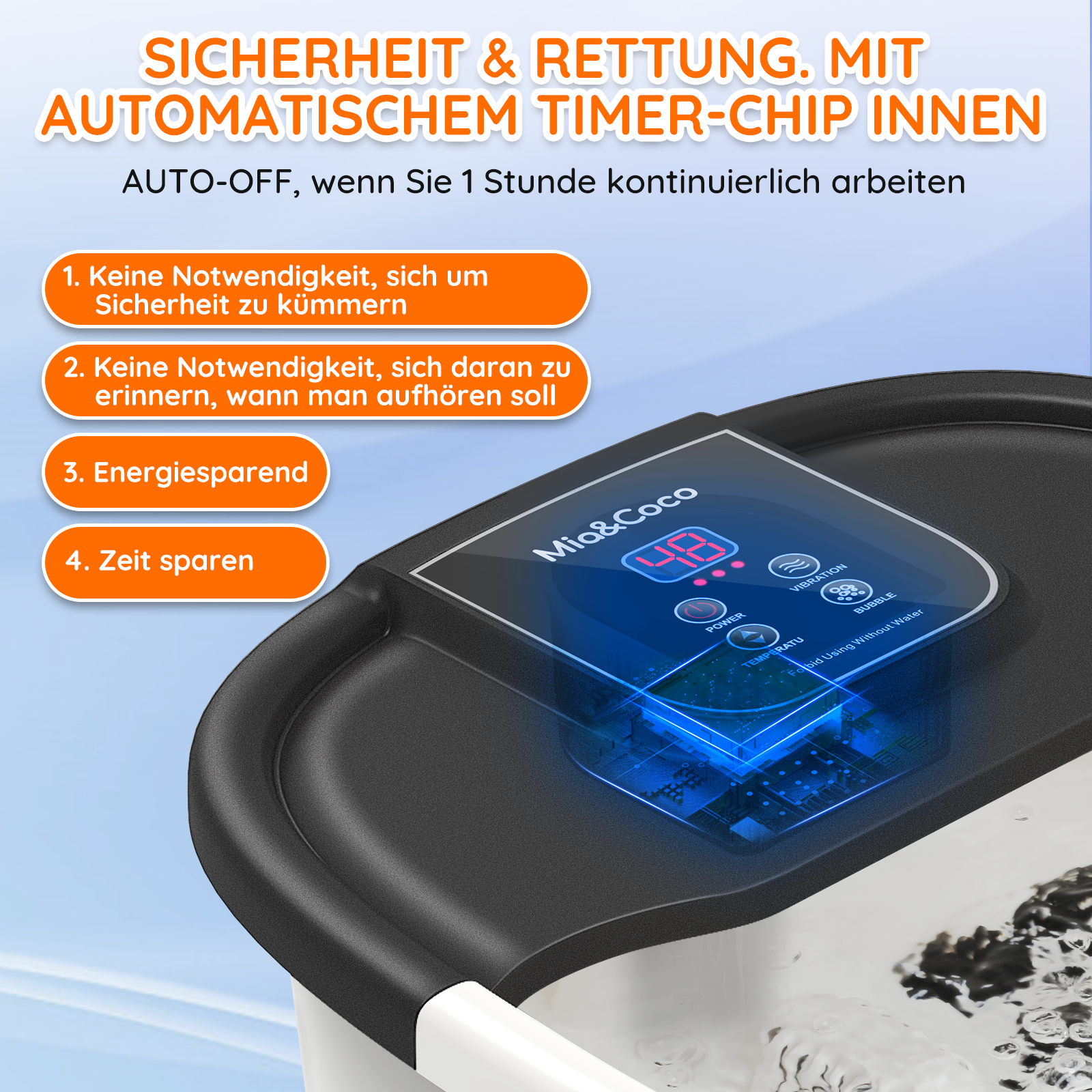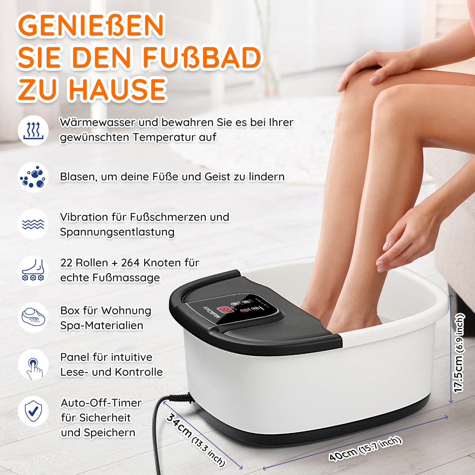 Gönnen Sie sich eine wohltuende Home SPA Massage für Ihre Füße! Dieses innovative Fußmassagegerät bietet Ihnen ein luxuriöses Entspannungserlebnis: Das Wasser wird erwärmt und auf Ihrer Wunschtemperatur gehalten, während Blasen und Vibrationen das Wohlgefühl steigern. Dank der eingebauten Rollen und des Timers können Sie sich voll und ganz fallen lassen – genießen Sie die Massage, schnappen Sie sich ein Buch und lassen Sie den Alltag hinter sich.