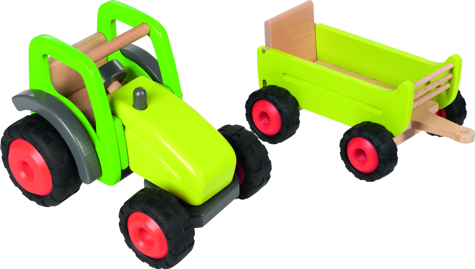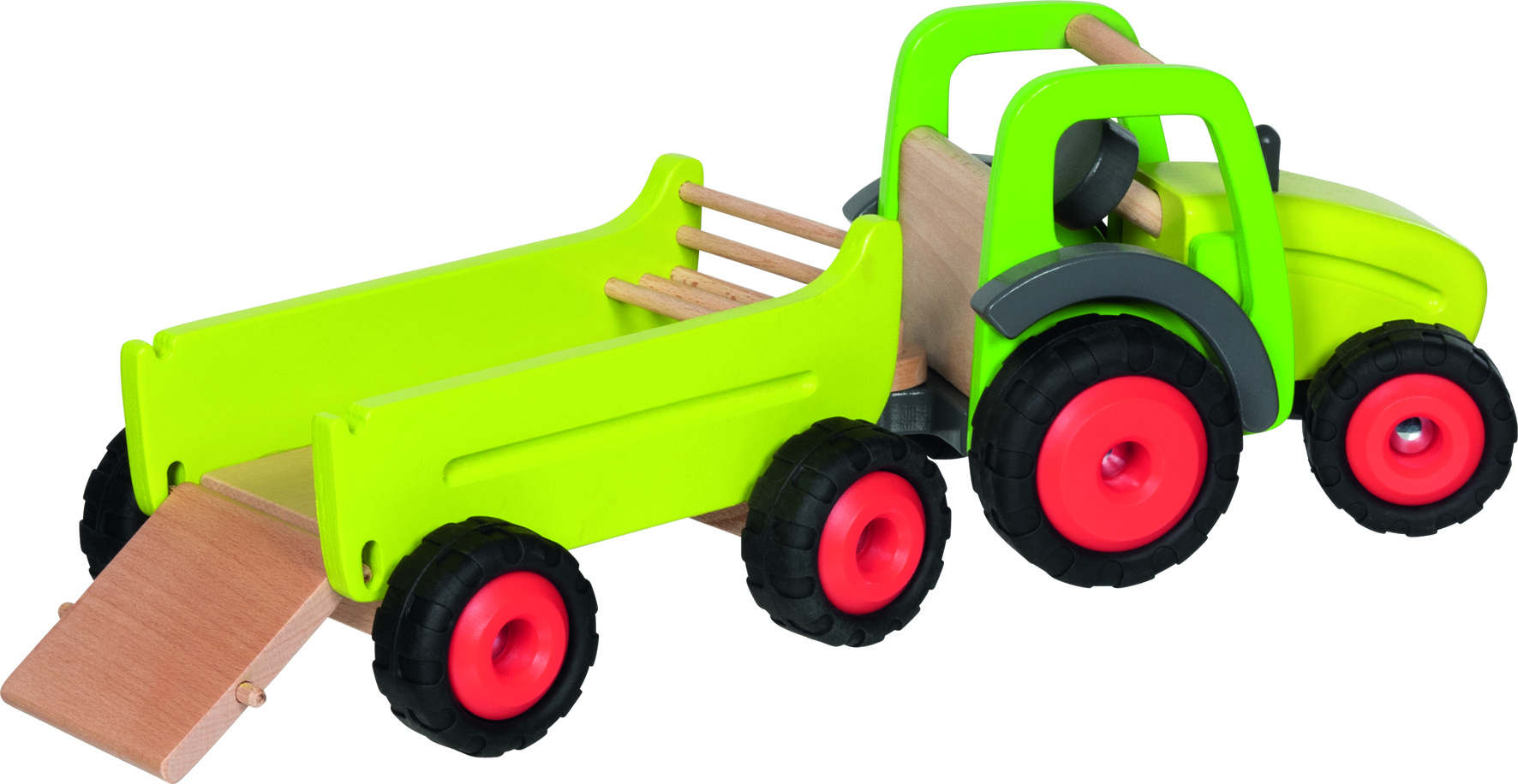 Der goki-premium Traktor mit Anhänger verwandelt jedes Kind in einen kleinen Landwirt. Dieses robuste Holzspielzeug ist aus massivem Buchenholz gefertigt und mit spielzeugsicheren Farben lackiert. Dank seiner lenkbaren Funktion und der flüsterleisen Gummibereifung ist der Traktor ideal für die "Feldarbeit" im Kinderzimmer oder draußen geeignet. Der extrem robuste Aufbau sorgt für lange Haltbarkeit und viele Stunden Spielspaß.