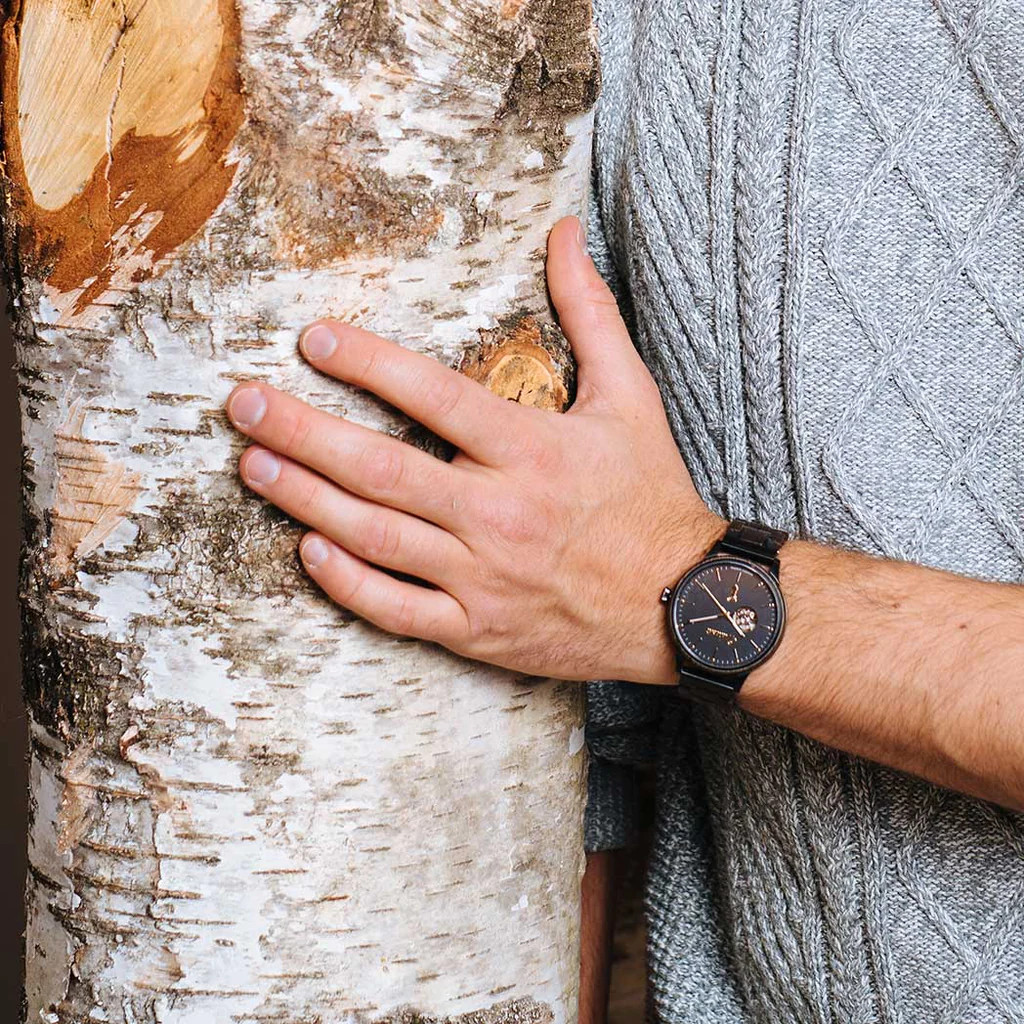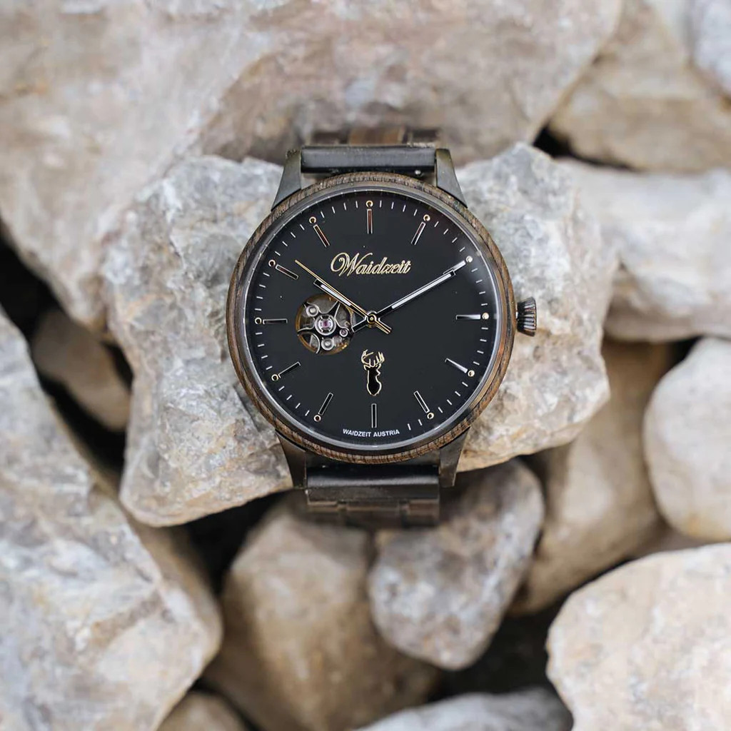 Mit ihrem edlen Holzarmband und minimalistischem Ziffernblatt strahlt die Uhr Eleganz aber auch Zwanglosigkeit aus und ist somit perfekt für jeden Anlass geeignet. Durch die aufwendige Einarbeitung der Mooreiche im Uhrengehäuse trägt diese Holzarmbanduhr die Seele antiker Eichenstämme, die über einen Zeitraum von Jahrhunderten in Mooren gelegen sind, in sich. Zudem legt Waidzeit großen Wert auf Nachhaltigkeit, wodurch alle Materialien ressourcenschonend bezogen und umweltfreundlich verarbeitete werden.