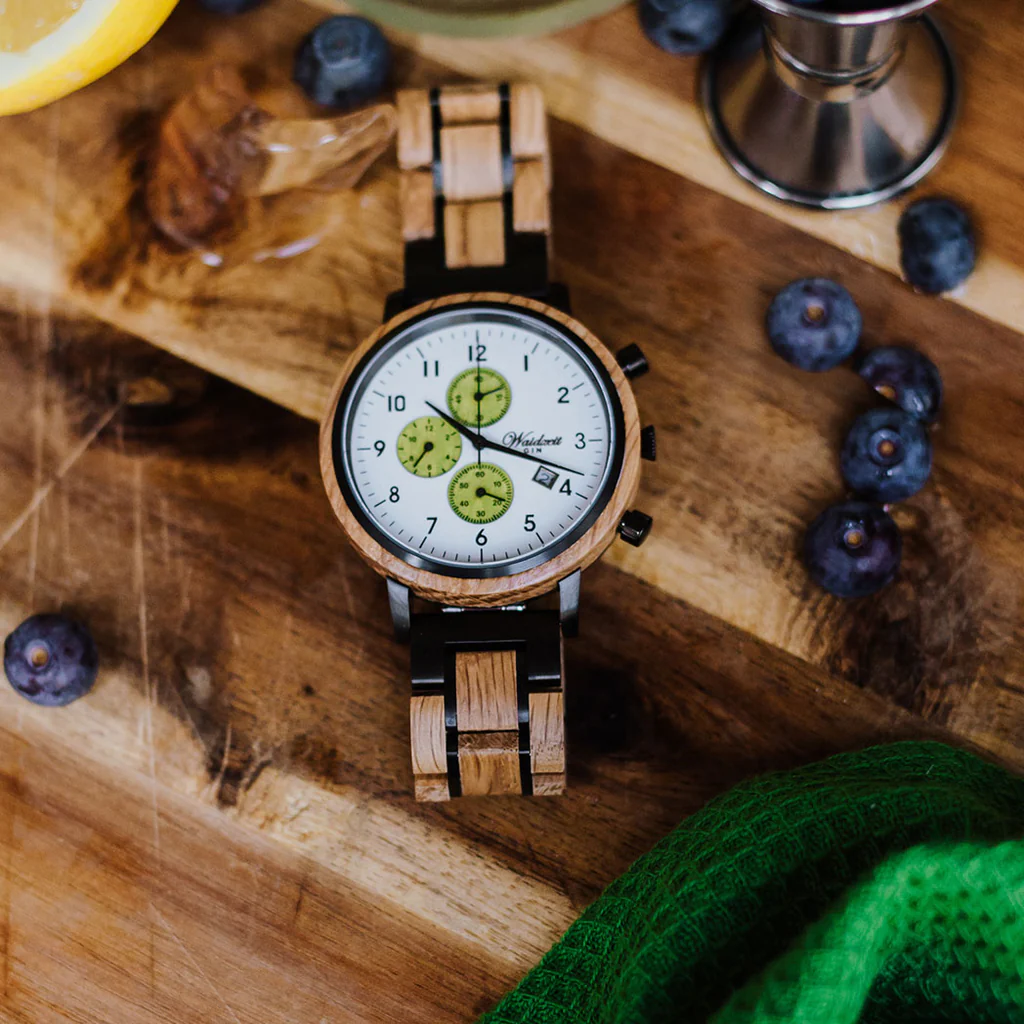 Durch die kunstvolle Einarbeitung des Wacholderholzes im Ziffernblatt, trägt dieser Chronograph die Seele des Gin in sich. Neben dem auffallend schönem Design und der Verarbeitung von Wacholder, ist das Gehäuse sowie das Armband dieser Herrenuhr aus up-gecycelten Barrique Eichenfass gefertigt.