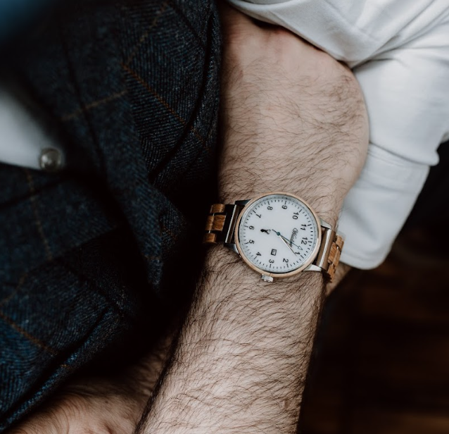 - Gehäuse aus Edelstahl eingefasst in Eichenholz