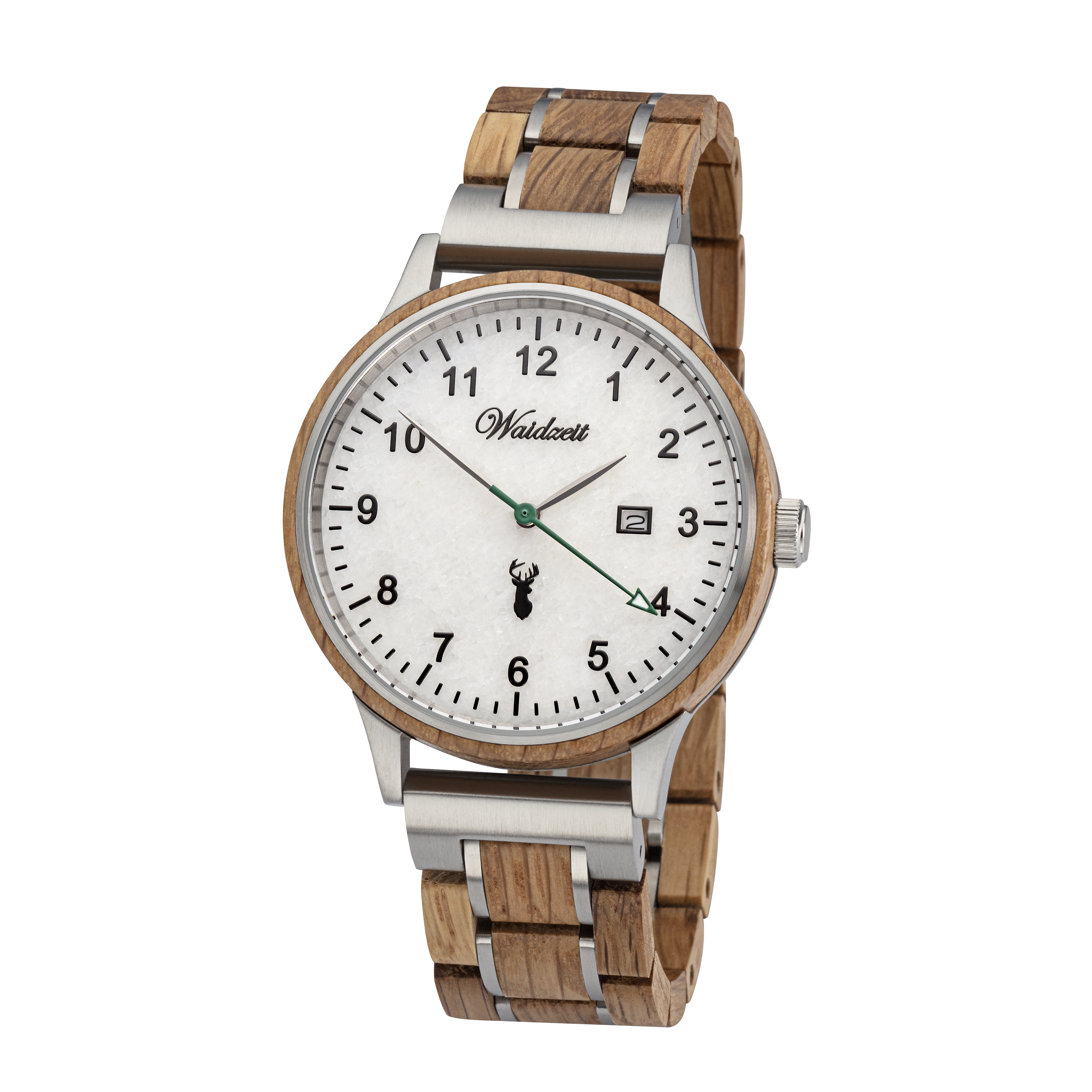 Das stilvolle, weiße Ziffernblatt aus Sölker Marmor verleiht dieser Herrenuhr einen besonders eleganten Charakter. Der grüne Sekundenzeiger symbolisiert das steirische Wappen und unterstreicht die Verbundenheit zur Region. Jede Uhr ist ein Unikat mit individueller Maserung und Struktur. Abgerundet wird das Design durch eine praktische Datumsanzeige, wodurch diese Uhr zu einem edlen und einzigartigen Geschenk wird.