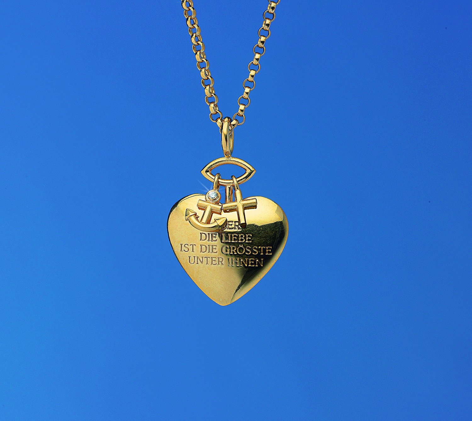 Mit Kreuz, Anker und Herz setzt Christiane Wendt den eingravierten Spruch zugleich ins Bild. Vergoldetes 925er-Sterlingsilber, mit einem kleinen Brillanten.