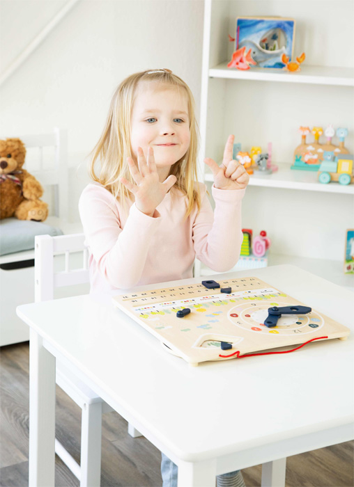Kalender oder Uhr? Beides! Diese Lernuhr aus FSC® zertifiziertem Holz unterstützt Kinder beim Erlernen der Uhrzeit im 12- und 24-Stundensystem und vermittelt zugleich Wissen zum Wetter, zu Wochentagen, Monaten sowie Jahreszeiten - und das ganz spielerisch mit Hilfe von einfachen Abbildungen. Beim Verstellen der Zeiger und Rädchen werden gleichzeitig motorische Fähigkeiten trainiert. Mit Aufhängevorrichtung und Aufklebern für die Nutzung in 15 europäischen Sprachen.