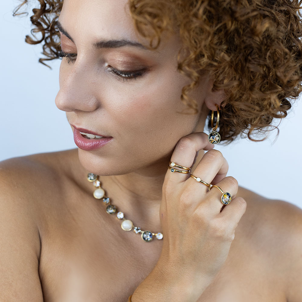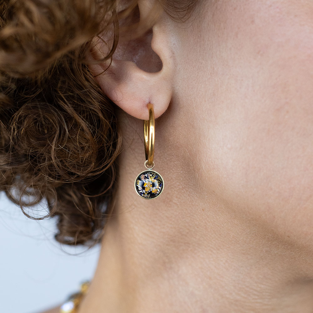 Edelstahlcreolen mit abnehmbarem Anhängelement aus vergoldetem Messing, besetzt mit böhmischen Glascabouchons. Handgefertigt in Berlin Kreuzberg.