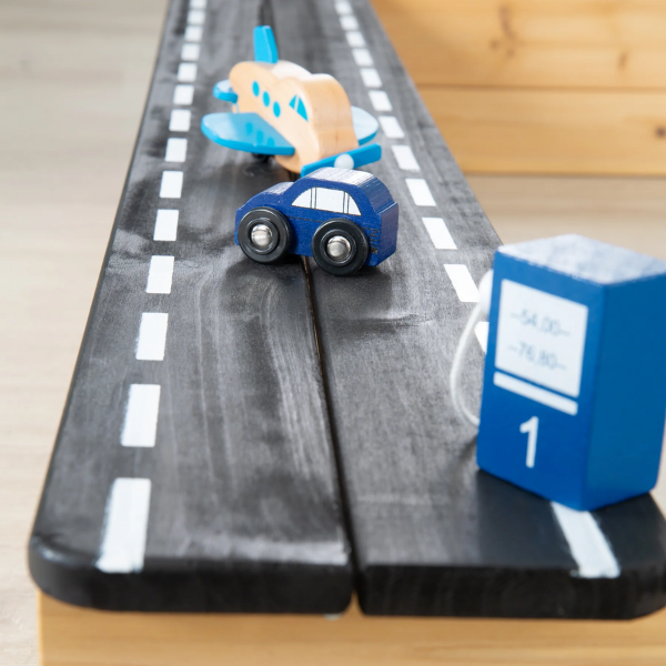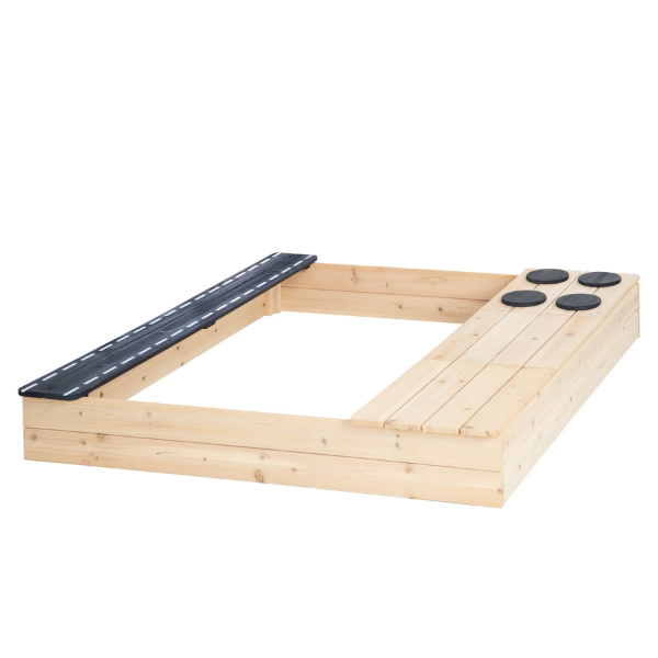 Der wetterfeste Sandkasten aus naturbelassenem Massivholz, überzeugt durch seine Stabilität und Langlebigkeit. Dieser Sandkasten ist nicht nur ein Spielplatz, sondern auch ein Ort für kreative Sand-, Wasser- und Matschspiele. Unter den abnehmbaren Sitzplatten verbergen sich zwei praktische Spielwannen sowie Staufächer für Spielzeug, die für Ordnung und Spaß sorgen. Die integrierte Straßenaufmalung regt die Fantasie an und ist perfekt für kleine Auto Fans. Die Spielküche mit aufgemaltem Kochfeld sorgt nochmal für zusätzlichen Spaß, perfekt zum Kochen mit Naturmaterialien.