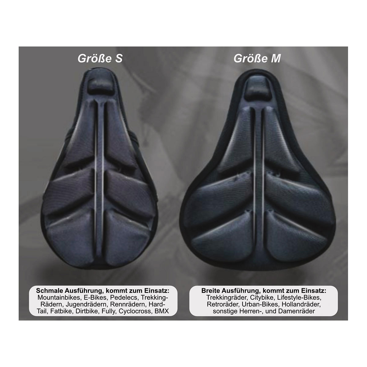 Unser luftgepolsterter Sattelüberzug kann fest an allen handelsüblichen Fahrradsätteln angebracht werden kann. Die Montage ist sehr einfach und schnell. Den Überzug einfach über den Sattel Stülpen und dann mit den Stretch-Klettbändern oder dem Strip unter dem Sattel Befestigen - schon ist er montiert! Durch zwei Größen "S" und "M" ist er auf nahezu 95% aller handelsüblichen Fahrradsättel montierbar.