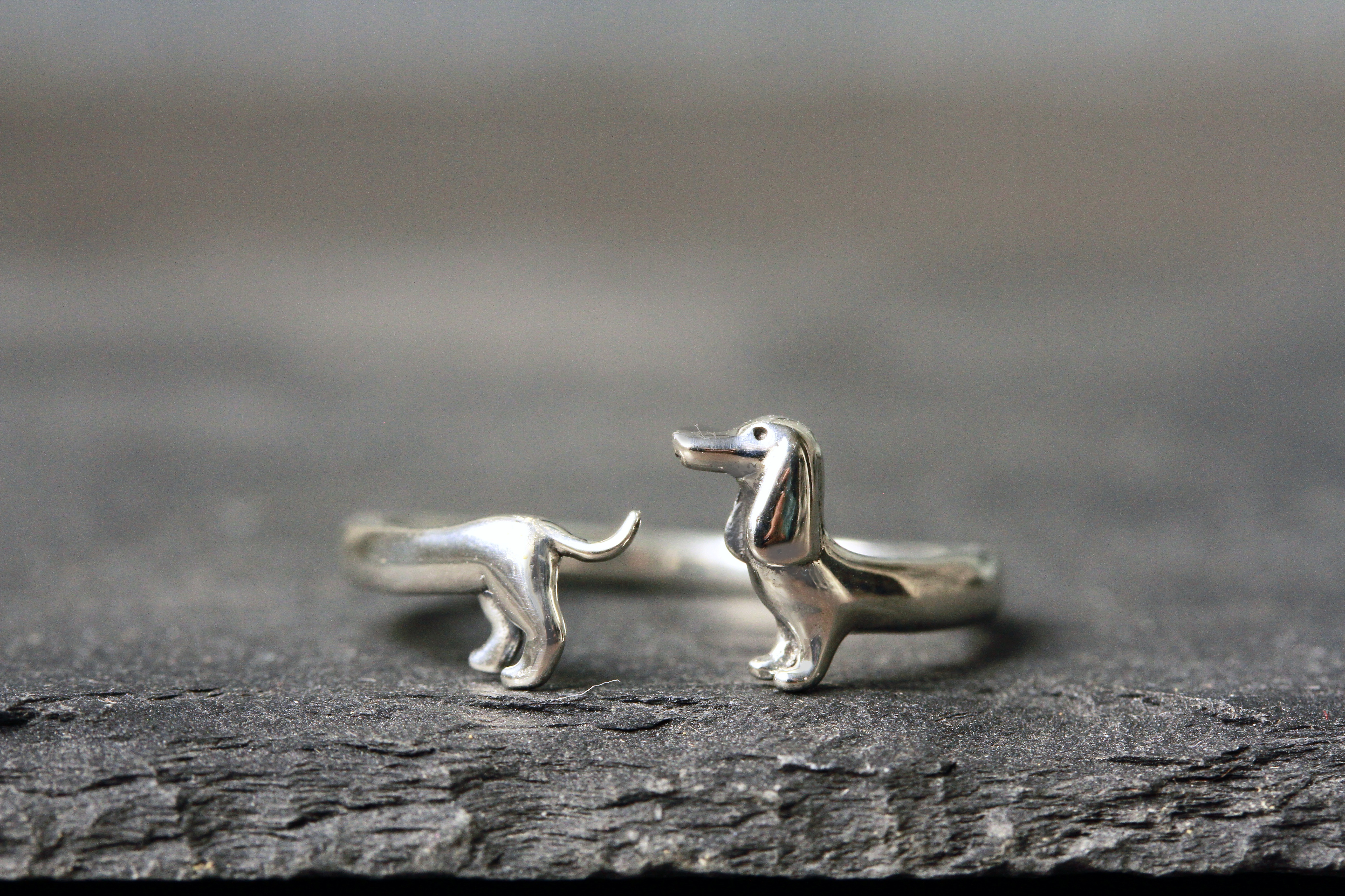 Ein fein ausgearbeiteter Ring aus Sterling Silber (925) mit einem kleinen, dreidimensionalen Dackel. Das Auge wurde durch Oxidation geschwärzt.