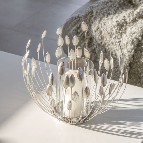 Das besondere Highlight dieses Windlichts ist das filigrane Blattmotiv, das sich um den gesamten Körper des Windlichts erstreckt. Die detailreiche Gestaltung verleiht dem Windlicht eine natürliche und zugleich moderne Ausstrahlung.